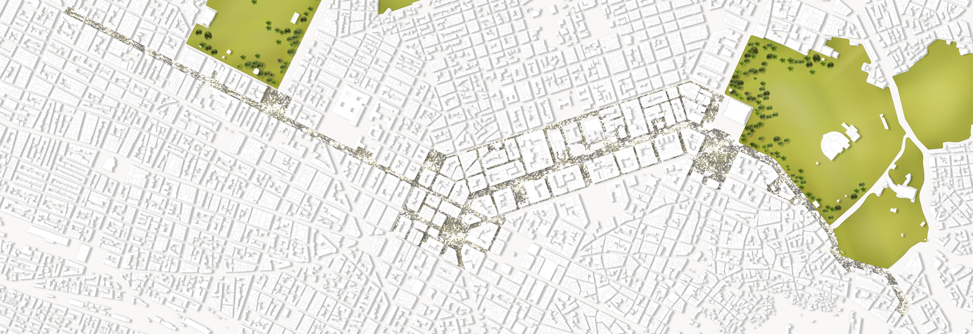 The main idea is to join the two parks at the end of the intervention (Pedion Areos and Lofos Likavitou) with a green mass that will flow all along the intervention, bringing back the greenery to an area that used to be a green zone in the outside of the old Athens walls and creating a green corridor that joins the old Athens with the new Athens (Ref 1). The project also aims at reducing and offsetting carbon emissions in order to achieve a zero-carbon balance, create new spaces for public activities and reduce the harsh climatic conditions of the city (Ref 4).
