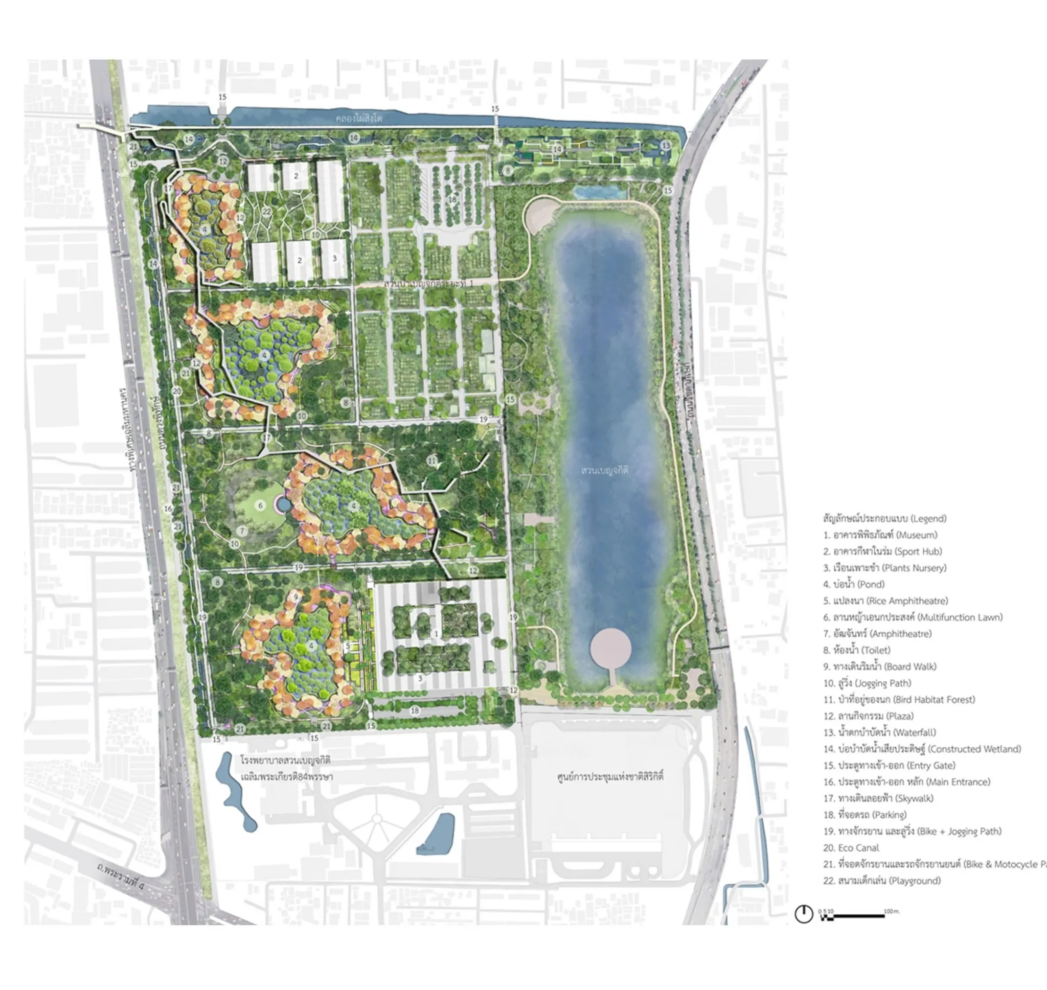 "In Thailand, public spaces in the form of forest gardens may be new and unfamiliar, but many places abroad have begun to build green spaces like this, such as the Hongkong wetland park from Hong Kong Floating Garden from China. The London Wetland Center from London all share a similar concept and design approach, aiming to bring the wilderness back into the city increase biodiversity and ecosystems, to create a space that supports humans and nature and create a large green area that returns to benefit all city residents." (Ref 3). The designers of the park adapted the concept to the local climate, the environmental challenges of the area as well as the community needs in the surrounding areas.
