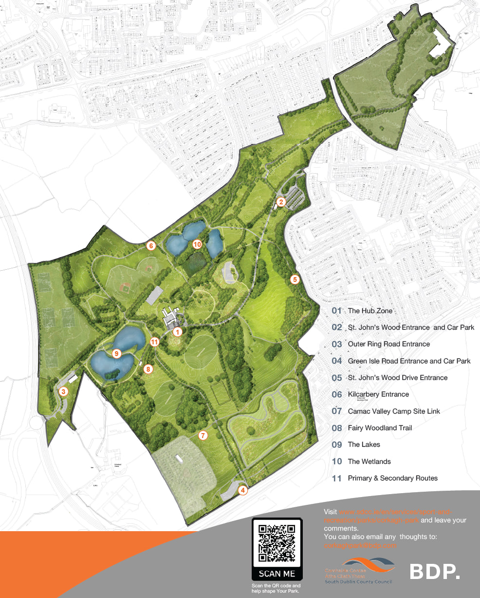 1. General information Location and description of the intervention City or FUA Dublin (FUA) Region Europe Short description of the intervention Corkagh Park, spanning 120 hectares, holds significant historical and cultural value for the local community of Clondalkin. The park offers an extensive range of facilities, including football pitches, a newly redeveloped playground, baseball pitches, cricket amenities, and a purpose-built road cycling track. Over the past two years, Corkagh Park has experienced a notable increase in footfall and usage as visitors are drawn to its expansive open spaces. With its rich vegetation, open wetlands, and rolling hills, Corkagh Park provides a unique environment that caters to both wildlife and human visitors. Since its establishment as a public park in 1986, the park’s vast open spaces have served the local community and attracted visitors from the broader region. Currently, Corkagh Park is surrounded by the Village of Clondalkin and nearby residential developments. Currently the park goes through a redevelopment process that involves redesign of several areas including introduction of native vegetation. The enhancement of the park is led by the South Dublin County Council and will feature a central hub area at the heart of the park. This hub will feature a coffee shop, an event space, additional seating, and new play areas. Enhancements to the Fairy Woodland Trail will include additional play elements and seating, as well as a new pedestrian pathway linking the lakes, while maintaining and safeguarding the existing mature trees. The project also includes the felling of ash trees affected by Ash Dieback, with these trees being replaced by native specimens to sustain the park’s ecological integrity. Native edge planting buffers will be established to reduce noise from the N7 and promote local biodiversity. Additionally, the project will address the existing car parks by implementing necessary improvements to better accommodate the park’s visitors. (4, 6) Website of the intervention https://www.sdcc.ie/en/services/sport-and-recreation/parks/corkagh-park.html Principal problems Environmental Degradation Biodiversity loss Land use and Socio-economic change Rapid urbanization Health, Well-being and Social cohesion Inadequate access to recreational opportunities Loss of sense of place and identity Implementation area characterization Climate Temperate ( Humid subtropical, Hot-summer Mediterranean, Warm-summer Mediterranean, Warm-temperate with dry winter) Ecosystem Urban or built environment Address Naas Rd, Newlands Cross Dublin Ireland Location The NBS is situated in an area, with clear delineation of boundaries and a specific shape (polygon). The NBS project can also have more than one area location (more than one polygon, situated close by). Area boundary (map-based) NBS area image Source of NBS area image Ref. 3 (CORKAGH PARK ENHANCEMENTS) Total area 120000.00m² NBS area 120000.00m² Area description Periurban (both urban and rural environments are present) Type of area before implementation of the NBS Public Greenspace Area Timeline of intervention Start date of the intervention (planning process) 2021 Start date of intervention (implementation process) 2023 End date of the intervention 2024 Present stage of the intervention Ongoing 2. Objectives of the intervention Objectives of the intervention Goals of the intervention To enhance the visitor experiences (tourism support) and interaction opportunities. To promote health and well-being facilities within the park by including walking and cycling routes, picnic areas, outdoor fitness equipment, and organized sports . To deliver a multi-functional destination space for events of various scales. To engage with local and regional visitors, aligning projects with community aspirations. To create year-round destinations for events and recreational activities. To improve legibility and wayfinding in the park, promoting universal accessibility while respecting Corkagh Park's historic landscape. To protect, enhance, and promote the park's natural assets, increasing local biodiversity and preserving heritage. (4) Key Priorities Biodiversity (conservation and/or restoration) Social Justice and community Sustainability challenge(s) addressed Green space, habitats and biodiversity (SDG 15) Green space creation and/or management Habitat and biodiversity restoration Regeneration, land-use and urban development Promote natural styles of landscape design for urban development Cultural heritage and cultural diversity Protection of historic and cultural landscape/infrastructure Health and well-being (SDG 3) Creation of opportunities for recreation Enabling opportunities for physical activity Social justice, cohesion and equity (SDG 10) Social justice and equity Social interaction Economic development and employment (SDG 8) Tourism support What types of restoration goals are / were defined for the NBS intervention? Genetic-focused What activities are implemented to realize the restoration goals and targets? Restore native species Implementation activities and NBS focus Implementation activities Main construction works at Corkagh Park began in August 2023 and are expected to continue for approximately 18 months. Given that Corkagh Park is a historic landscape, extensive archaeological investigations were necessary prior to construction. Initial investigations took place in Spring 2023, followed by additional excavations in July 2023, to ensure that no historical artifacts or structures, such as those associated with the Castle and Moated Site, were damaged. These excavations were conducted under an archaeological license granted by The National Monuments Service. Construction in the hub zone, which includes building a new purpose-built café, began in 2023 and will continue through 2024. This hub will serve as a central gathering area within the park, enhancing the visitor experience with amenities such as public to