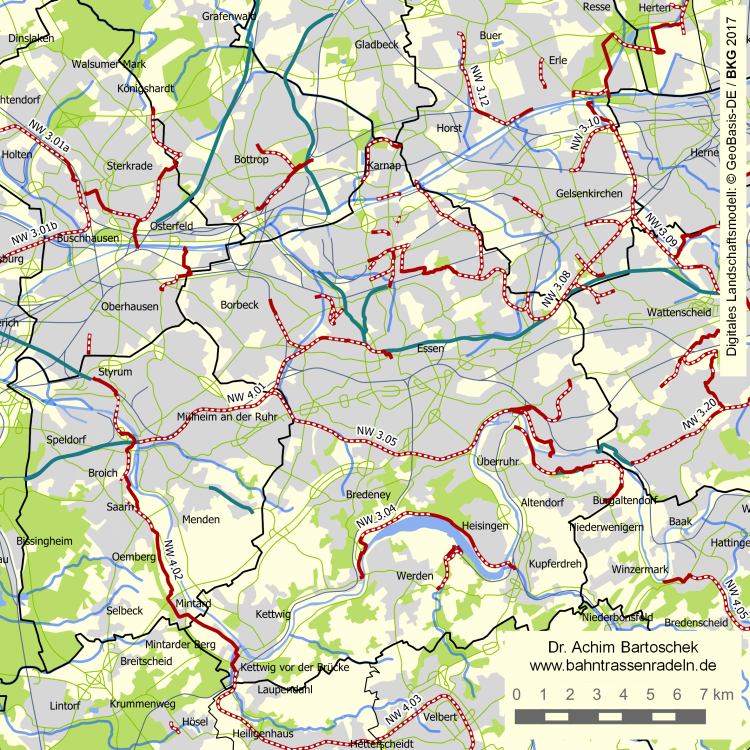 The Rheinische Bahn is a part of a cycle highway Radschnellweg Ruhr RS1 which is now considered as the longest (101 km) mobility infrastructure for cyclists and pedestrians in the world (3).