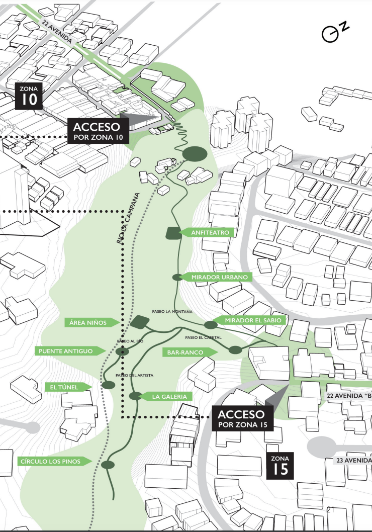 - convert the ravine into an ecological park and, therefore an "active territory within the urban functioning without compromising [its] environmental qualities" (Ref. 1);