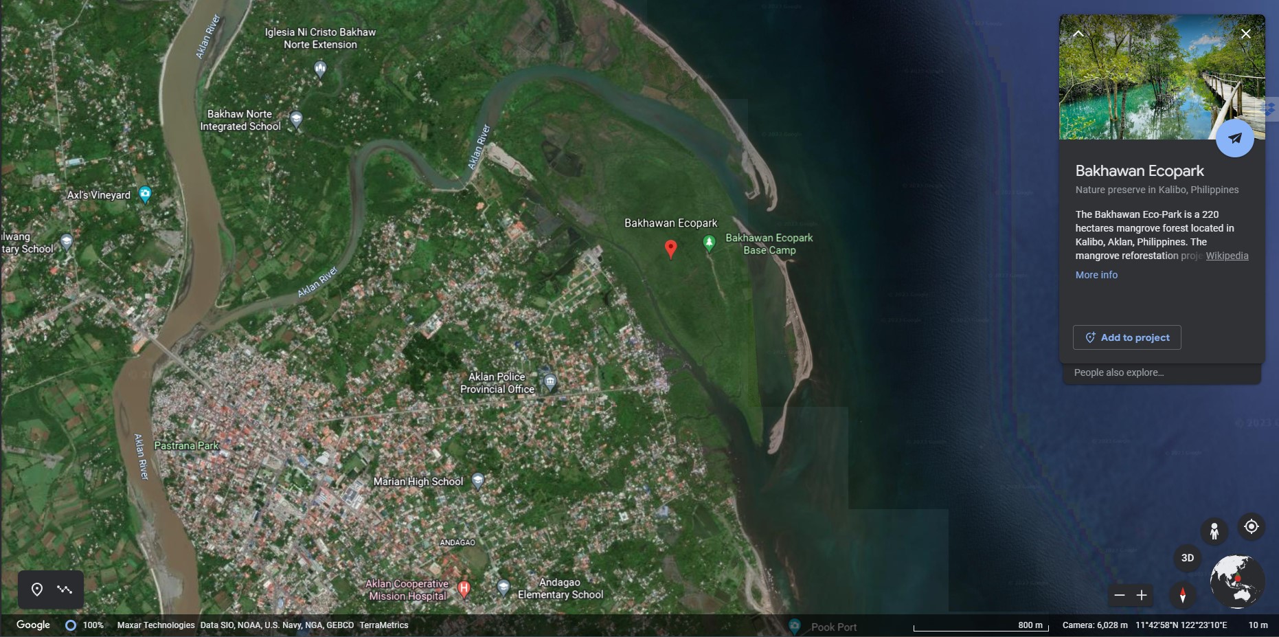 The reforestation project of the Bakhawan Eco-Park started in 1990 with the creation of 50 hectares (120 acres) of reclaimed land in Barangay New Buswang by the Kalibo Save The Mangroves Association (KASAMA), a non-governmental organization. The local government of Kalibo, Aklan, and the Department of Environment and Natural Resources (DENR) provided assistance [1,2]. The DENR engaged local families to plant mangroves and KASAMA also removed the fish pens from the mangrove area to facilitate reforestation [2]. In 1990, 250 000 mangroves were planted and since then, mangroves have continuously been planted. To augment the mangrove population, the Economic Enterprise Development Department of the Provincial Capitol of Aklan planted 8,000 new mangrove propagules over 2 hectares (4.9 acres) of the Eco-park in 2014 [1]. Over the years, the mangrove site has expanded to cover 220 hectares [2]. An ecotourism destination was also established in the area, featuring a 1.3-kilometer bamboo trail leading visitors deep into the mangrove forest. Additionally, various amenities were constructed, including a watchtower, souvenir shop, canteen, massage area, charcoal briquetting area, picnic huts, and a Center for International Mangrove Studies [1]. KASAMA also cultivates and sells mangrove seedlings to visitors [2]. There is also a research center inside the park, which conducts soil assessments to determine suitable mangrove species for planting and researches soil erosion and its effects on the mangroves. [2] The regenerated mangrove forest is also attributed to protecting nearby villages from the severe impact of Typhoon Fengshen in 2008 and Typhoon Haiyan in 2013. It also offers a means of income and livelihood for the local families and helped locals to access fish and seashell during the COVID-19 pandemic have [2,3]