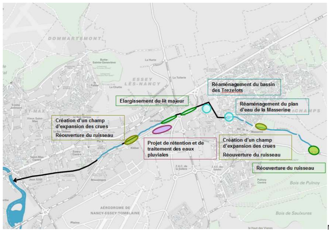Renaturation plan to avoid over flows, and using nature (trees, vegetation to create swales) to fight against flooding and improve water quality. (Ref. 1, 2 and 3)