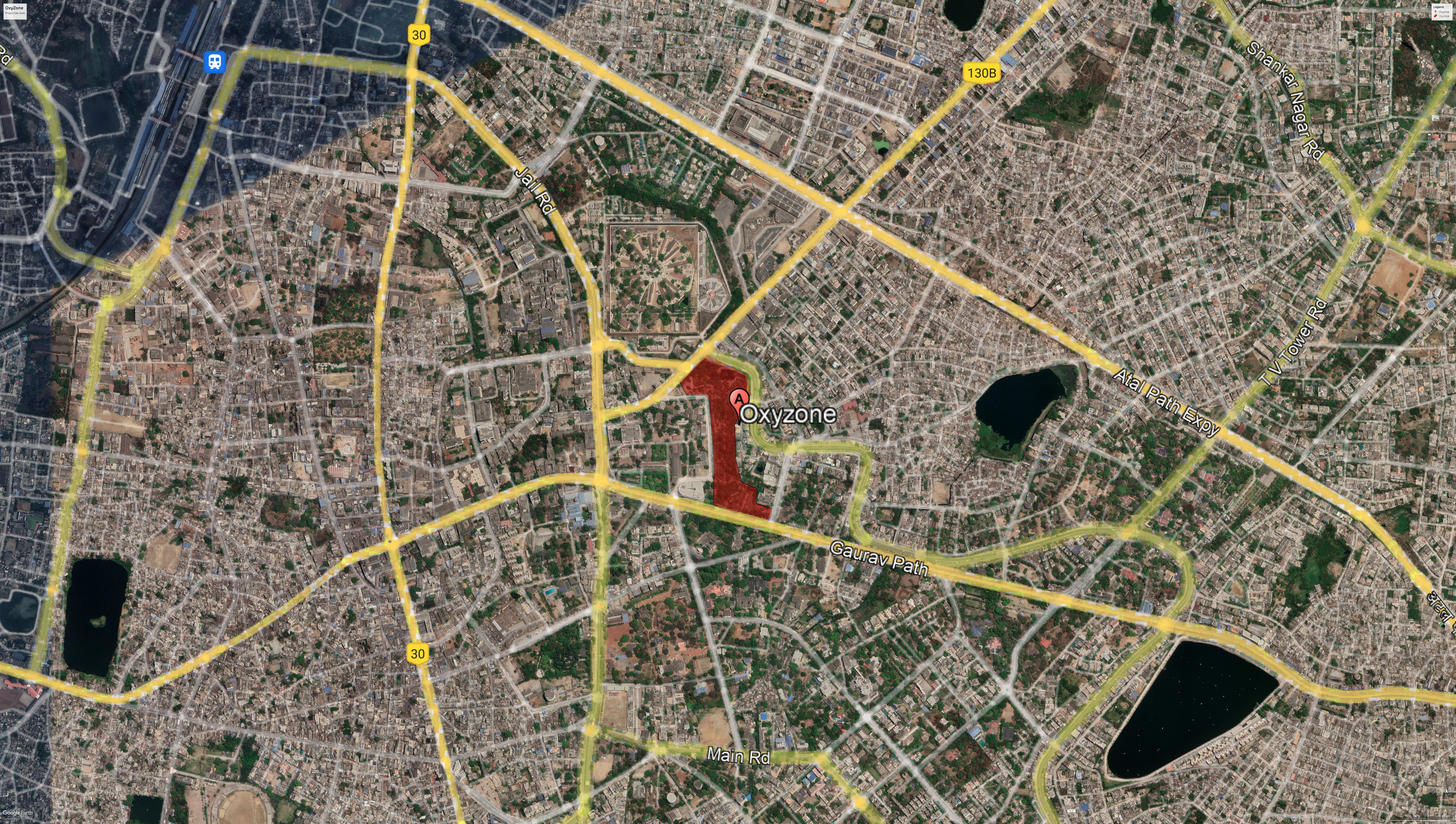 The Oxyzone Project was implemented by the Chhattisgarh State Forest Development Corporation Limited as a much-needed green lung for Raipur City (1, 2). The project led to the creation of an urban forest in the heart of the city, with the government choosing to dismantle infrastructure and forego a plot of land worth Rs 1,000 crore for the project. (6) This previously built-up area, which had no lawns or manicured gardens, is now home to trees, plants, and ponds for groundwater recharge (1, 2). The plantation drive of 5000 trees took place in two stages, with the first stage covering 12 acres of green space and the second stage covering 7 acres (1). The plantation included specific species of trees and ornamental plants that provide maximum oxygen, such as Banyan trees (1, 4). The project also created human-made water bodies and revived existing lakes and ponds to increase the availability of groundwater (Ref. 2) and planted saplings on roadsides, traffic dividers and other available lands as a flood prevention measure for the monsoon season (Ref. 4). The created area also offers a range of recreational activities such as walking and jogging pathways, meditation and yoga zones, children's play areas, and open gyms (1, 2, 3, 4). Additionally, an Oxy-Reading Zone was created, which serves as an indoor-outdoor library and study nook for students and reading enthusiasts to read, learn, and engage in a verdant environment (1, 4).