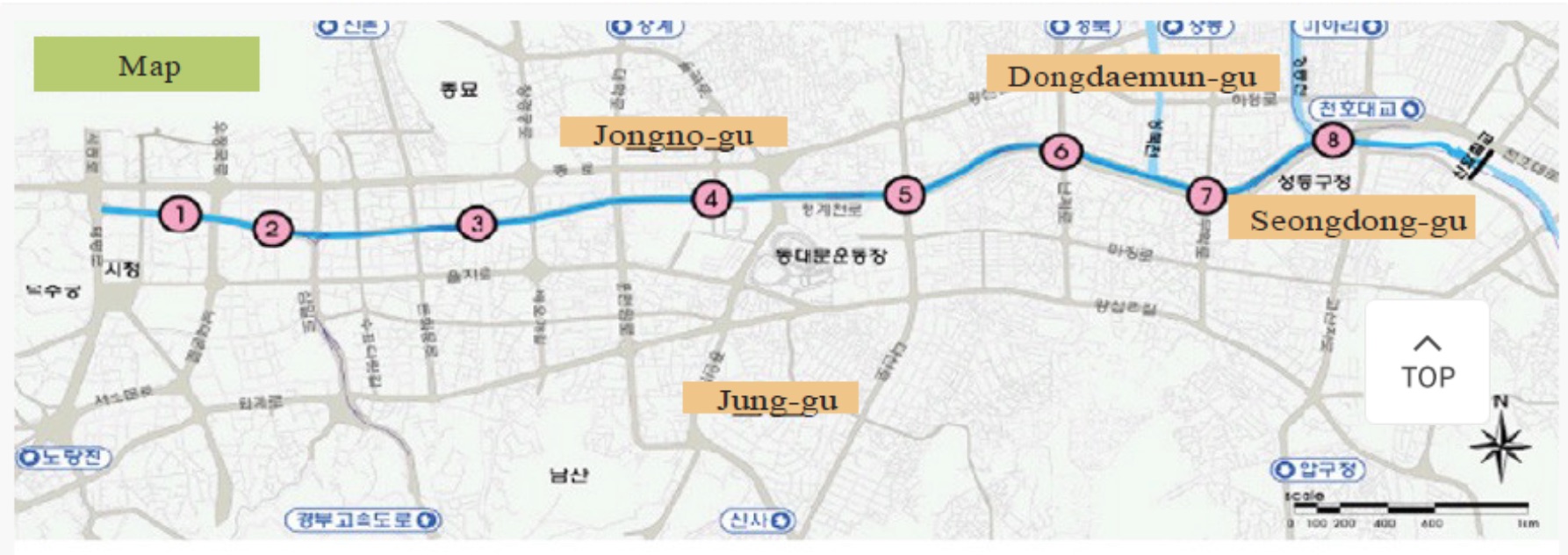 5.48km of the Cheonggyecheon stream were to be uncovered and restored and a landscaped green pathway to run along its banks (Ref. 4). The resulting green corridor was to run from "Seoul to an ecological conservation area outside the city and is split into three zones which mark the transition from an urban landscape to a natural environment" (Ref. 4).