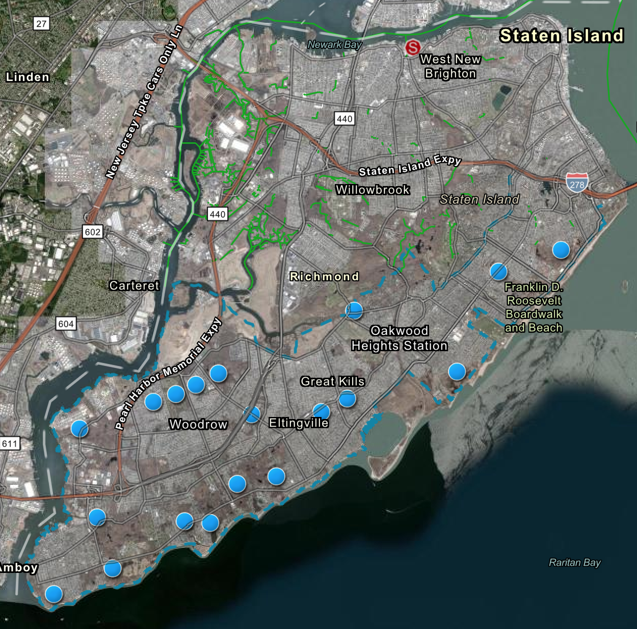 Due to the pace of residential development on Staten Island during the 1970s and 1980s, concurrent factors arose regarding inadequate drainage infrastructure, high reliance on septic tanks, and development of unsuitable land, including on "the historic flow paths of the natural creek system of the area" (Refs. 1 & 4). Residential developments were therefore prone to flooding: a "recurring pattern of winter and spring floods wash[ed] through new developments sited in these historic paths", and "wet weather compromised poorly designed septic systems, compounding the impact of these floods" (Ref. 4). As a result, "the area was prone to frequent localized flooding and erosion due to uncontrolled stormwater, and degraded water quality caused by failing septic systems" (Ref. 5).